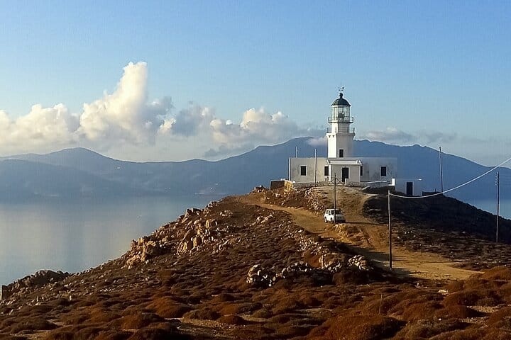 The tour includes a scenic drive to the Mykonos Lighthouse, offering sweeping views of the island and the Aegean Sea, an ideal spot for capturing stunning photos.