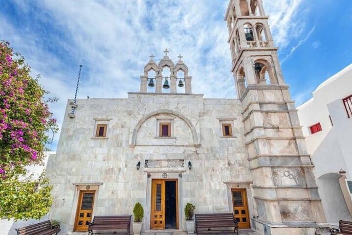 We’ll pause for a short stop in Ano Mera, one of the few traditional villages left on Mykonos. Here, you’ll have about 10 minutes to stretch your legs, explore the peaceful village square, or catch a glimpse of the historic Panagia Tourliani Monastery.