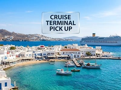 Cruise-friendly Mykonos tour with port pick-up. Stroll through Mykonos Town at a relaxed pace, enjoying the charming streets, shops, and scenic views—perfect for a stress-free island experience.