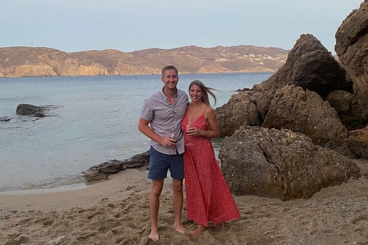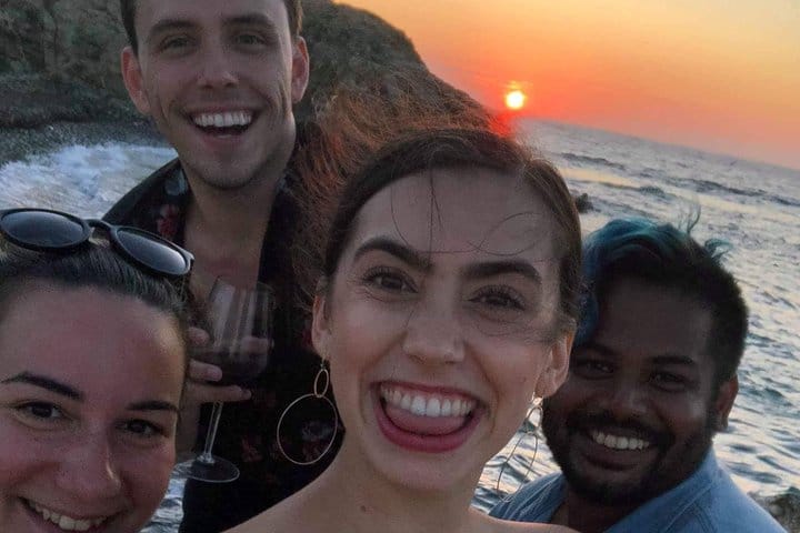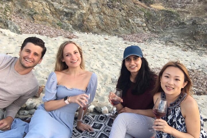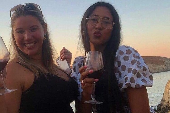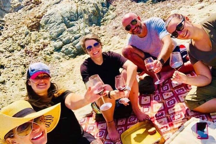 This experience starts in a secret beach location in a relaxed beachside setup. You will unwind on the comfy beach cushions and enjoy the wine, the magnificent view, the sun and the sea.
